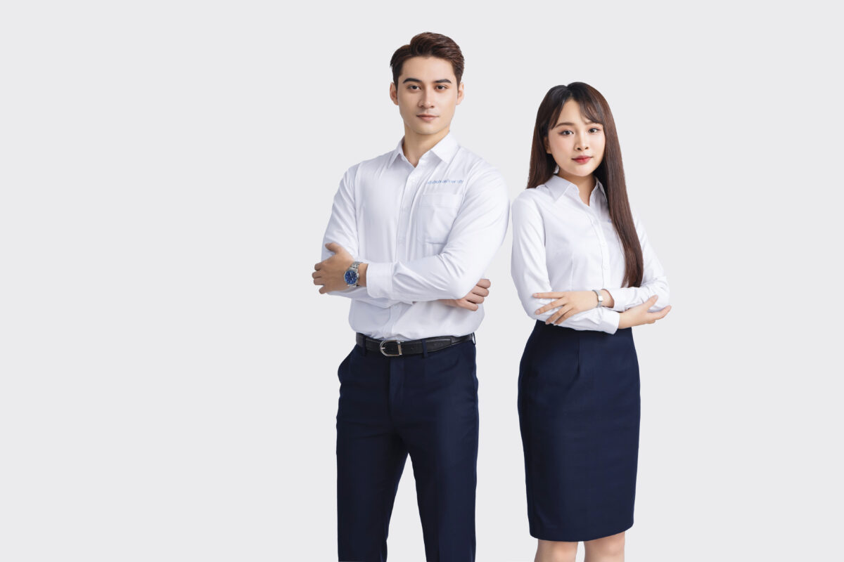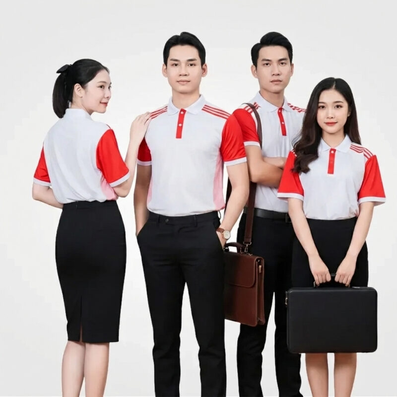 Đồng phục công ty, công sở được thiết kế theo phong cách trẻ trung, hiện đại nhưng vẫn giữ được vẻ thanh lịch, nghiêm túc, phù hợp với môi trường làm việc. Đồng phục công ty có thể bao gồm các mẫu như áo thun đồng phục, áo sơ mi, quần tây – chân váy, đồng phục áo vest, áo khoác,… Màu sắc của đồng phục sẽ có sự tương đồng với bộ nhận diện thương hiệu và thường có hình in logo trên mẫu đồng phục.